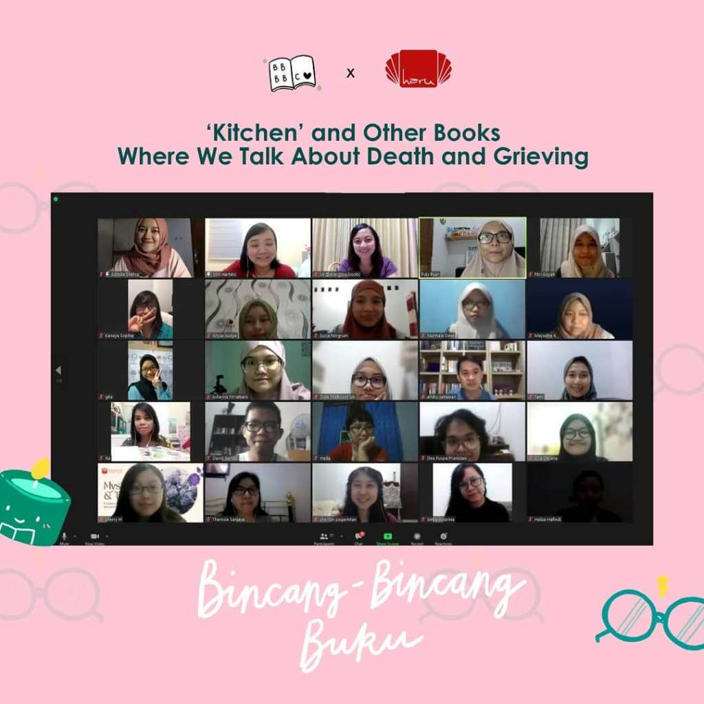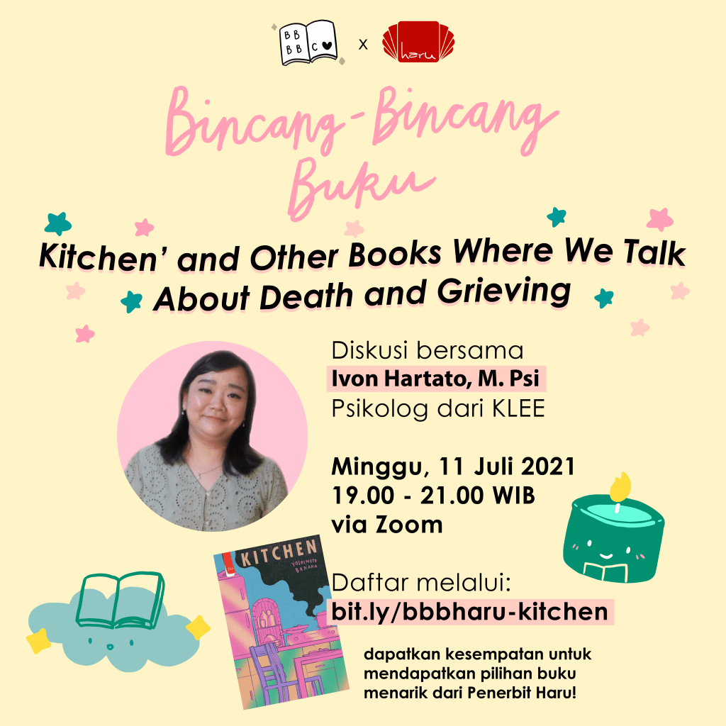 Pada acara diskusi ini Buibu Baca Bulu berkolaborasi dengan @penerbitharu yang juga menghadirkan narasumber Ivon Hartato M.Psi, Psikolog dari KLEE (@klee.id). Acara dimulai dengan pemaparan Ivon tentang duka dan bagaimana menghadapinya, dilanjutkan dengan diskusi buku. Buku yang dibahas bukan hanya ‘Kitchen’ karena para peserta membawa dan merekomendasikan buku bertema duka dan kematian pilihannya.