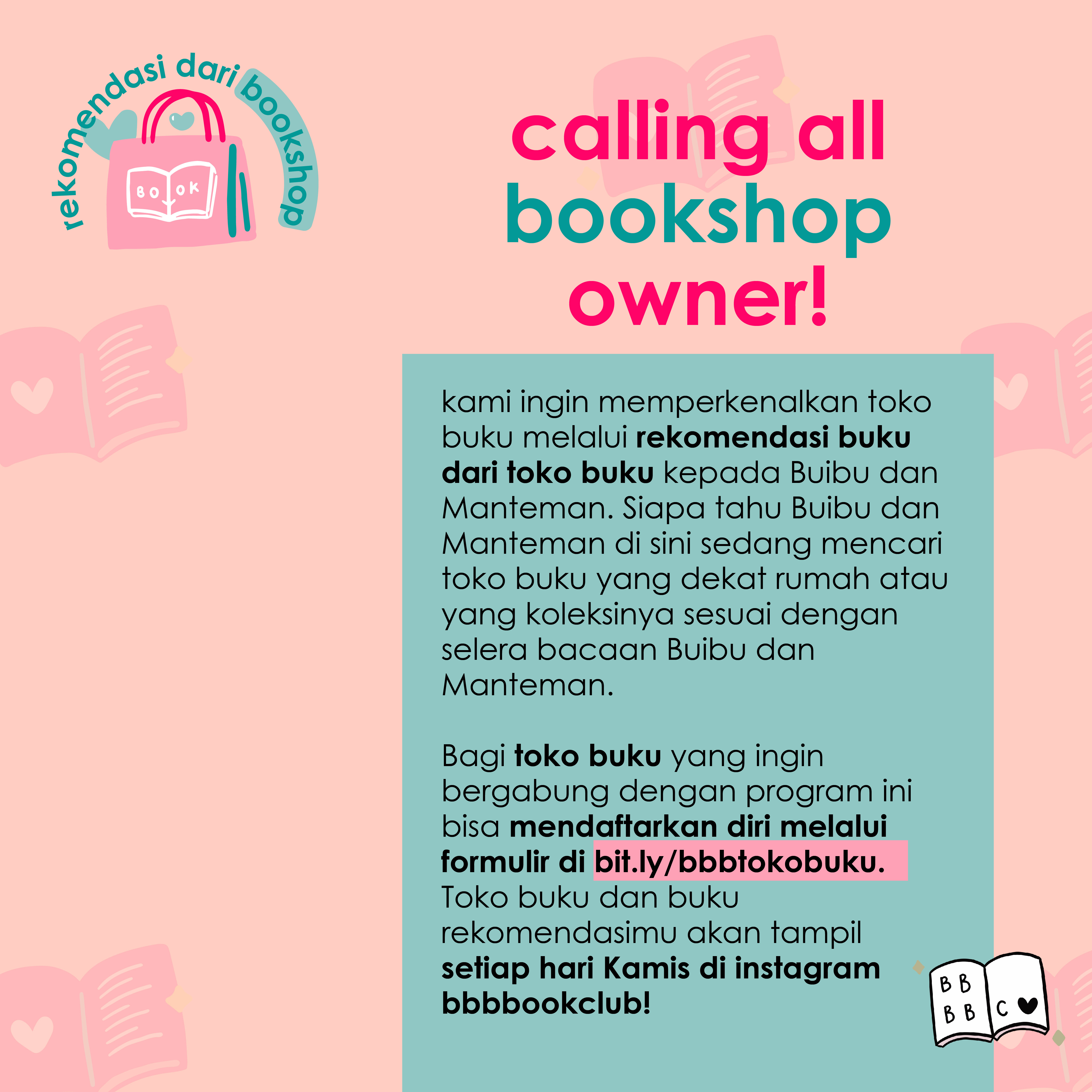 Toko buku yang terpilih akan dikontak untuk menyiapkan konten rekomendasi buku dan perkenalan toko. ‘Rekomendasi dari Bookshop’ akan tayang di halaman Instagram @bbbbookclub setiap hari Kamis mulai 15 Juli 2021 ini.