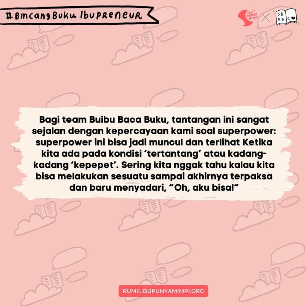 Bagi team Buibu Baca Buku, tantangan ini sangat sejalan dengan kepercayaan kami soal superpower: superpower ini bisa jadi muncul dan terlihat Ketika kita ada pada kondisi ‘tertantang’ atau kadang-kadang ‘kepepet’. Sering kita nggak tahu kalau kita bisa melakukan sesuatu sampai akhirnya terpaksa dan baru menyadari, “Oh, aku bisa!”