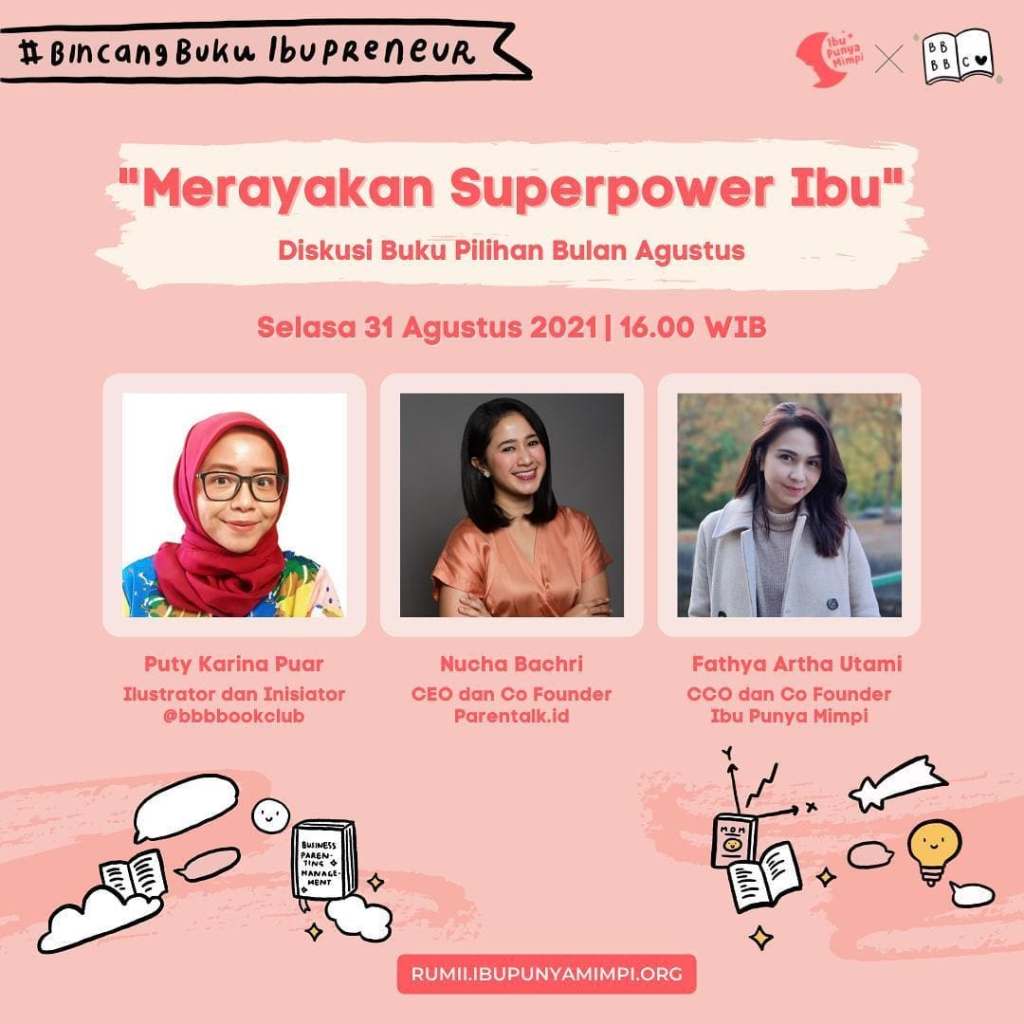 Bulan Agustus ini Ibu Punya Mimpi memilih tema ‘Merayakan Superpower Ibu’. Tema ini kemudian coba diadaptasi ke program kolaborasi #BincangBukuIbupreneur dengan Buibu Baca Buku. Kali ini pilihan bukunya pun istimewa, karena kalau biasanya buku yang direkomendasikan di program kolaborasi ini adalah buku yang sudah pernah dibaca dan dibahas oleh @bbbbookclub, ketiga buku ini diusulkan oleh tim Ibu Punya Mimpi yang memang sudah lama ada di daftar TBR alias ‘To Be Read’ BBB tapi belum diselesaikan.