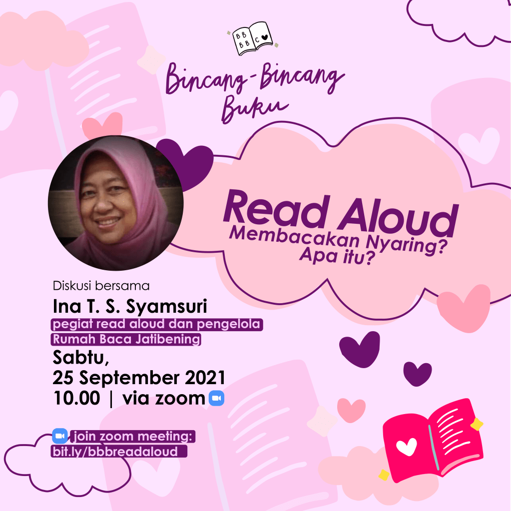 BBBBookclub bersama dengan Ibu Ina, seorang pengelola Rumah Baca dan pegiat read aloud, berbincang dengan kita semua tentang membaca nyaring dan bagaimana dasar-dasar prakteknya.