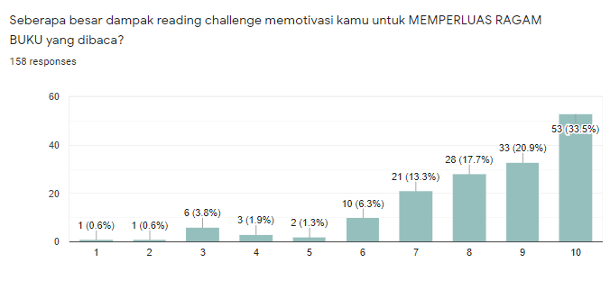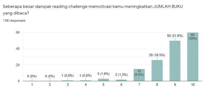 Berdasarkan 158 respon yang masuk pada Reading Challenge Wrap Up 2021, mengatakan bahwa ‘Reading Challenge’ memotivasi untuk meningkatkan MINAT & KONSISTENSI membaca (93%), JUMLAH BUKU yang dibaca (86%) dan MEMPERLUAS RAGAM BUKU yang dibaca (73%)