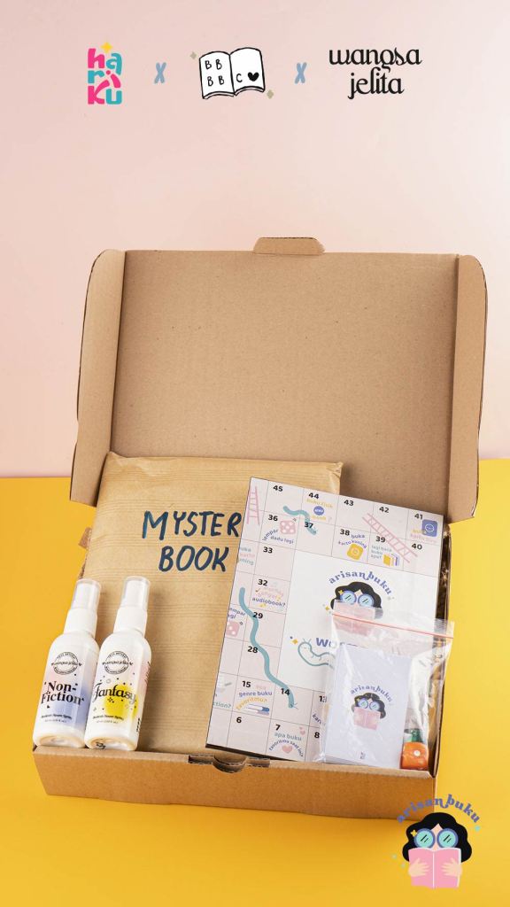Kami menyediakan sebuah paket Mystery Box yang berisi salah satu buku sesuai tema yang bisa dipilih dan berbagai merchandise untuk mendukung kegiatan membaca.