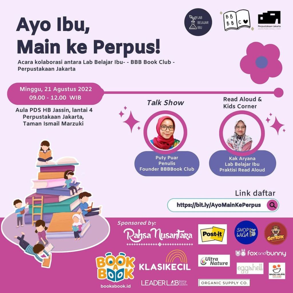 Lab Belajar Ibu berkolaborasi dengan @perpusjkt dan @bbbbookclub mengadakan kegiatan terkait Literasi Keluarga berupa talkshow berjudul “Ayo Ibu, Main Ke Perpus!” dengan narasumber, Puty Puar. Para ibu yang datang bersama anak, difasilitasi dengan kids activity berupa Read Aloud dan Crafting.