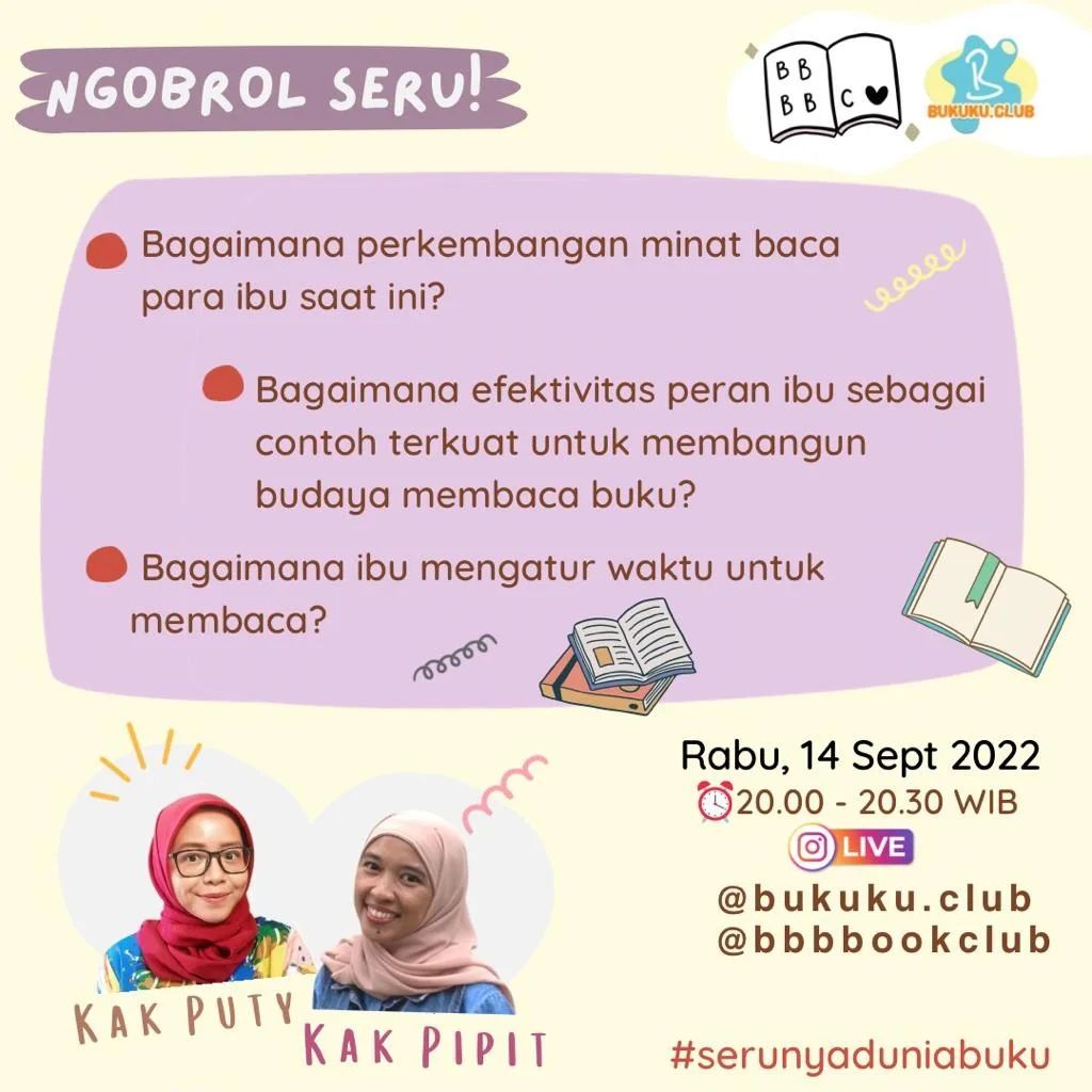 Dalam IG Live kolaborasi Bukuku Club & Buibu Baca Buku, kami mengulik lebih jauh soal kebiasaan membaca pada anak dari perspektif peran orang tua (dalam hal ini ibu) sebagai contoh penggiat baca di rumah.