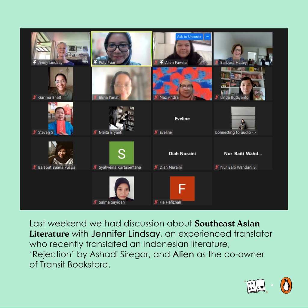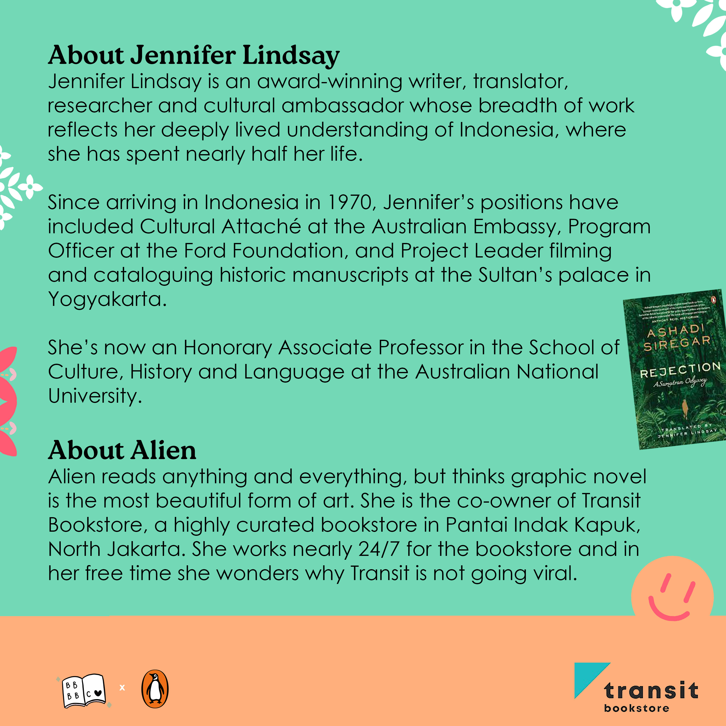 Alien reads anything and everything, but thinks graphic novel is the most beautiful form of art. She is the co-owner of Transit Bookstore, a highly curated bookstore in Pantai Indak Kapuk, North Jakarta. She works nearly 24/7 for the bookstore and in her free time she wonders why Transit is not going viral.