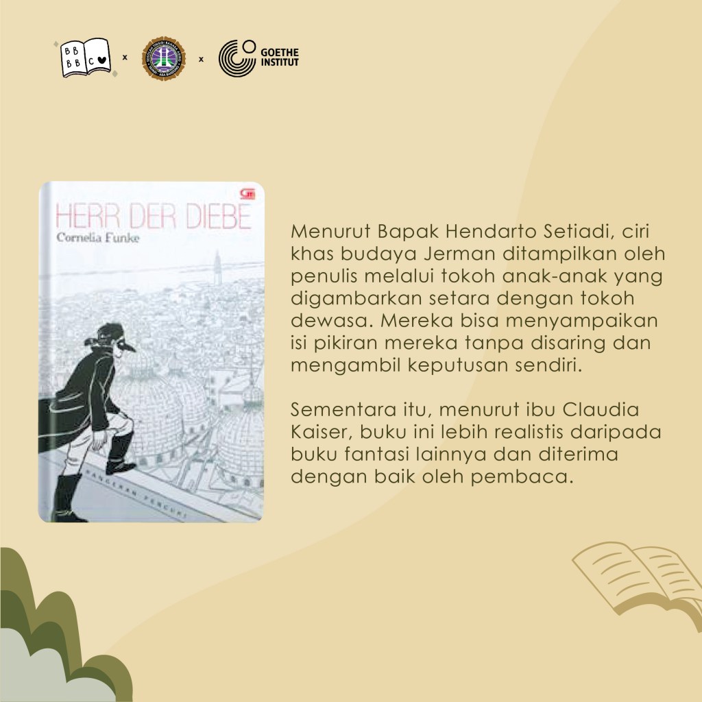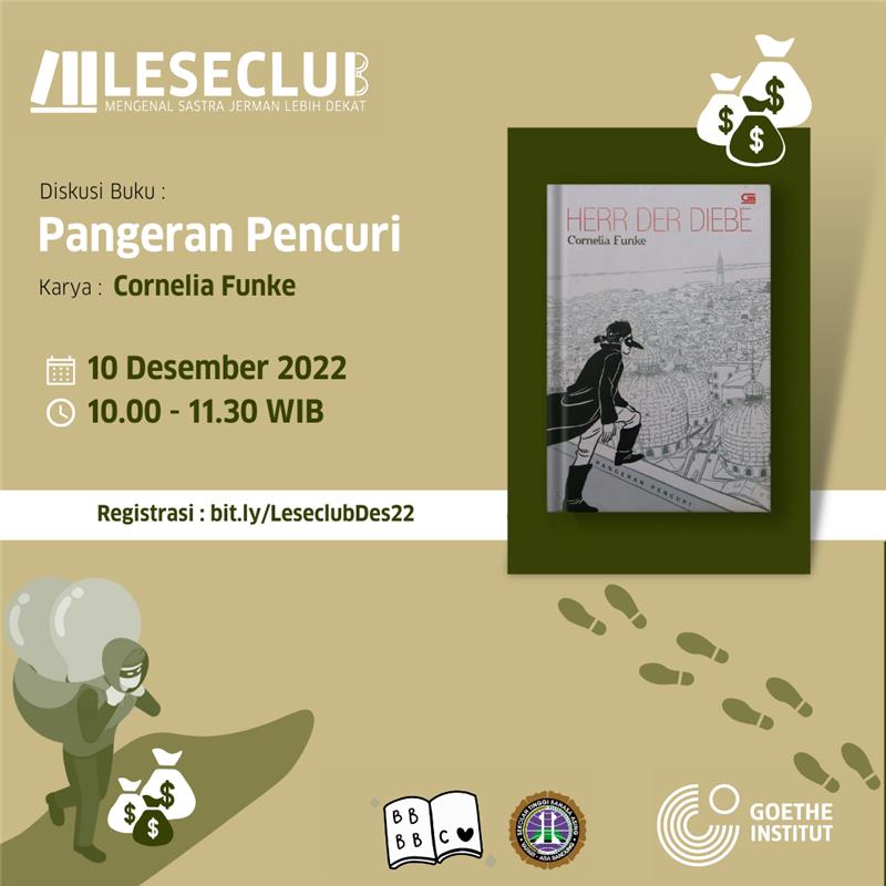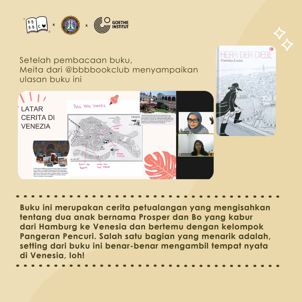 Bulan November ini Leseclub kembali hadir. Bersama Goethe Institut Bandung kami membahas buku ‘Herr der Diebe’ atau Pangeran Pencuri karya Cornelia Funke. Buku ini bercerita tentang kakak beradik Prosper dan Bo yang melarikan diri dari Hamburg, Jerman, ke Venezia, Italia, untuk menghindari paman dan bibinya setelah ibu mereka meninggal. Ada petualangan seru yang menanti mereka berdua di Venezia.