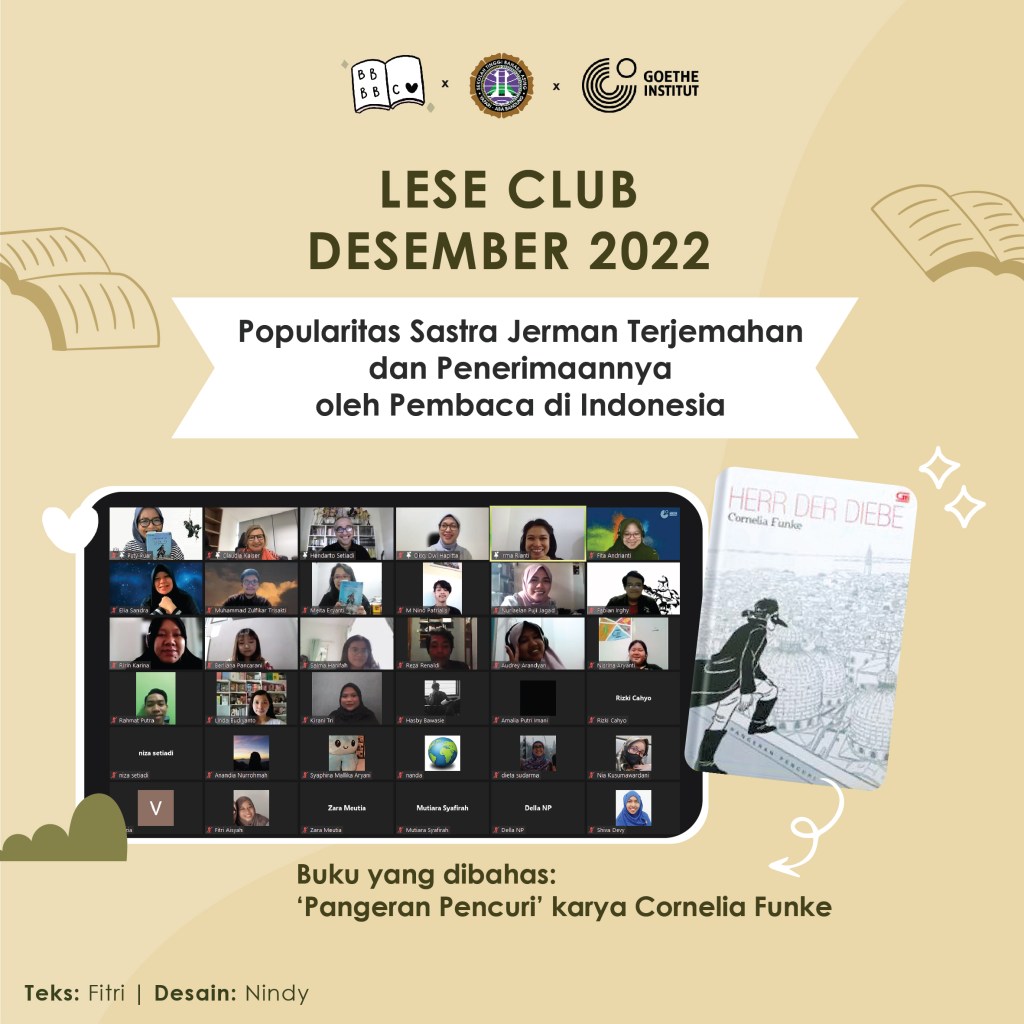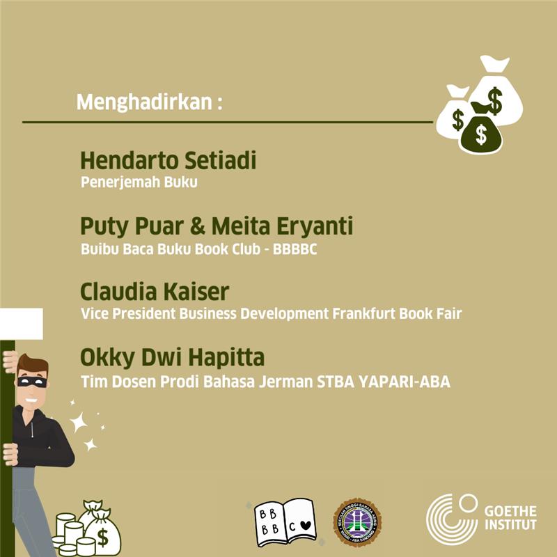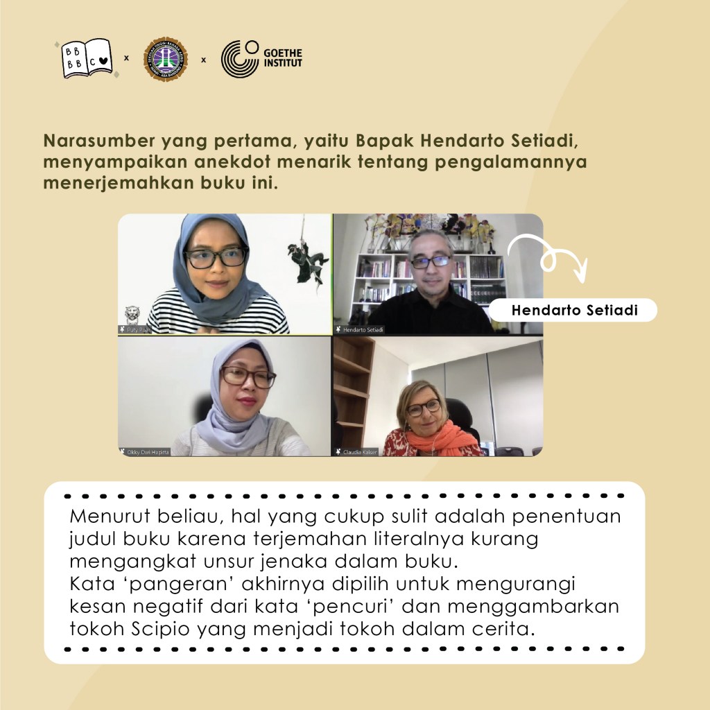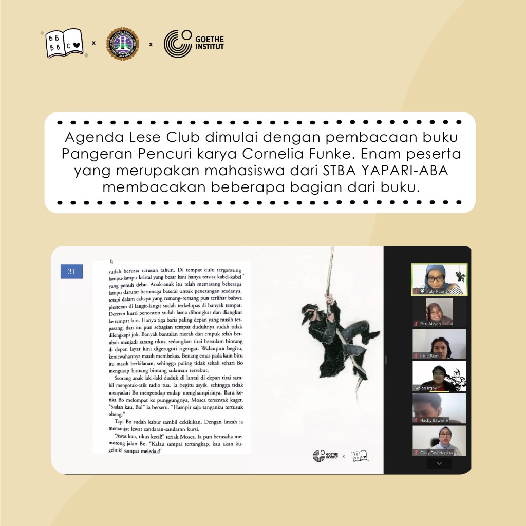 Acara dimulai dengan pembacaan serta pengulasan buku secara interaktif kemudian dilanjutkan dengan sesi diskusi dengan berbagai narasumber mengenai popularitas sastra Jerman yang diterjemahkan ke dalam bahasa Indonesia saat ini dan penerimaannya oleh pembaca di Indonesia. Diskusi berjalan seru sekali karena dihadiri oleh Bapak Hendarto Setiadi, penerjemah buku ‘Pangeran Pencuri’, dan Ibu Claudia Kaiser, Vice President Business Development dari Frankfurt Book Fair. Hadir pula teman-teman dan Ibu Okky Dwi Hapita yang merupakan Dosen dan Ketua Program Studi Bahasa Jerman STBA Yapari ABA Bandung.