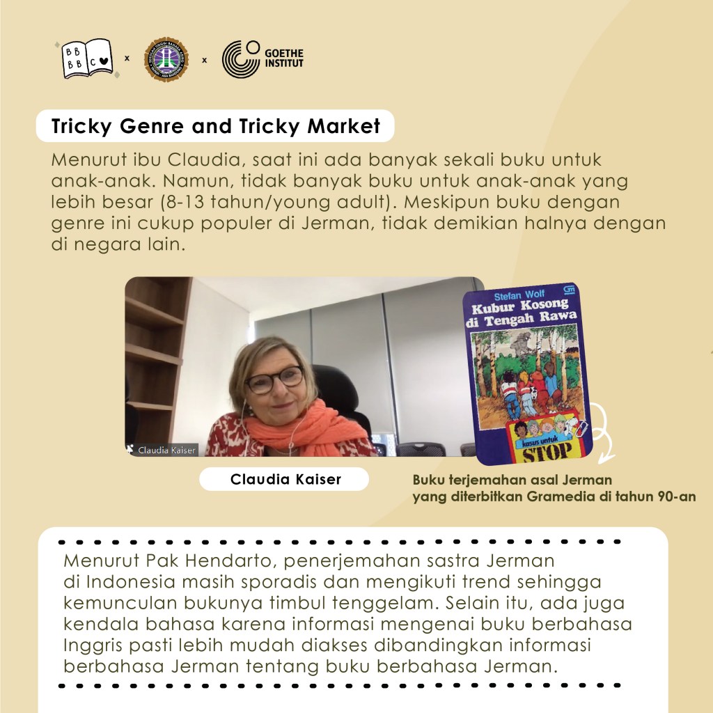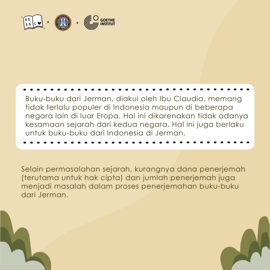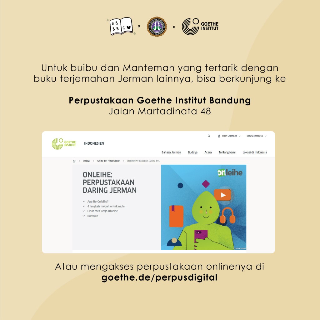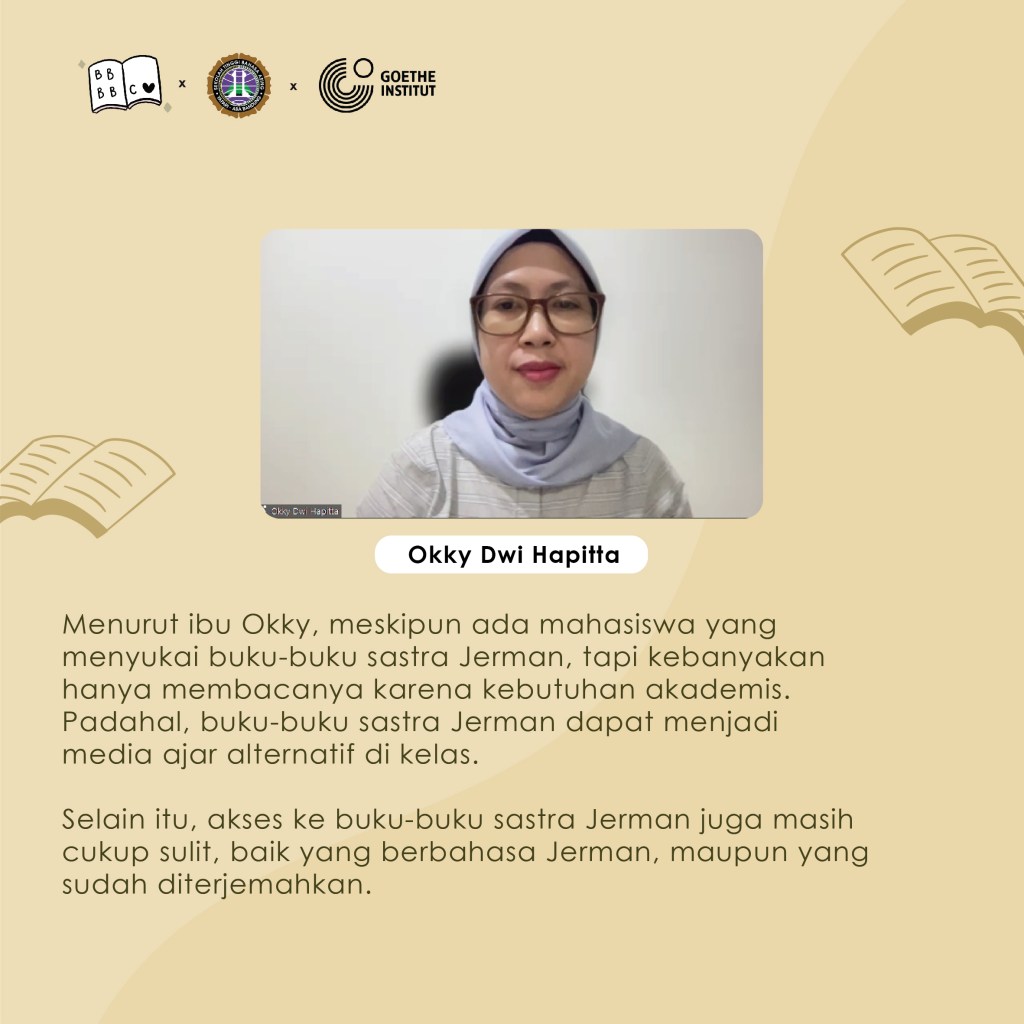 Acara dimulai dengan pembacaan serta pengulasan buku secara interaktif kemudian dilanjutkan dengan sesi diskusi dengan berbagai narasumber mengenai popularitas sastra Jerman yang diterjemahkan ke dalam bahasa Indonesia saat ini dan penerimaannya oleh pembaca di Indonesia. Diskusi berjalan seru sekali karena dihadiri oleh Bapak Hendarto Setiadi, penerjemah buku ‘Pangeran Pencuri’, dan Ibu Claudia Kaiser, Vice President Business Development dari Frankfurt Book Fair. Hadir pula teman-teman dan Ibu Okky Dwi Hapita yang merupakan Dosen dan Ketua Program Studi Bahasa Jerman STBA Yapari ABA Bandung.