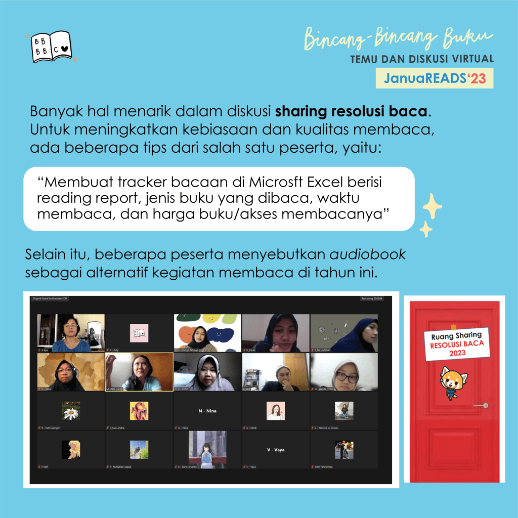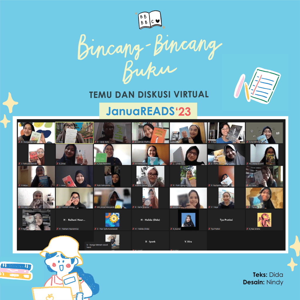 JanuaREADS is back! Kami kembali berkumpul dan ngobrol santai via Zoom tentang buku yang sedang dibaca atau ingin dibaca di 2023!