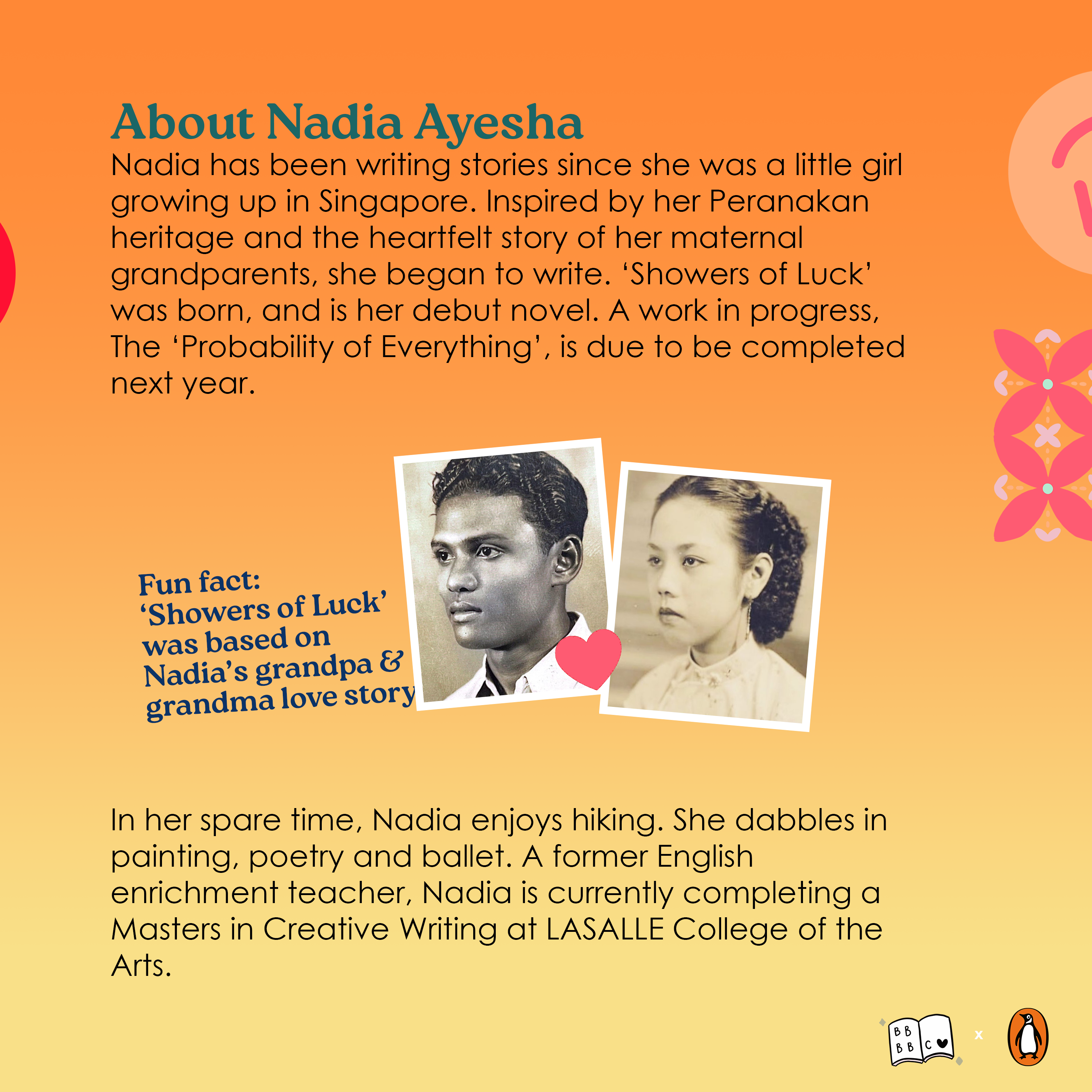 Nadia has been writing stories since she was a little girl growing up in Singapore. Inspired by her Peranakan heritage and the heartfelt story of her maternal grandparents, she began to write. ‘Showers of Luck’ was born, and is her debut novel. A work in progress, The ‘Probability of Everything’, is due to be completed next year.