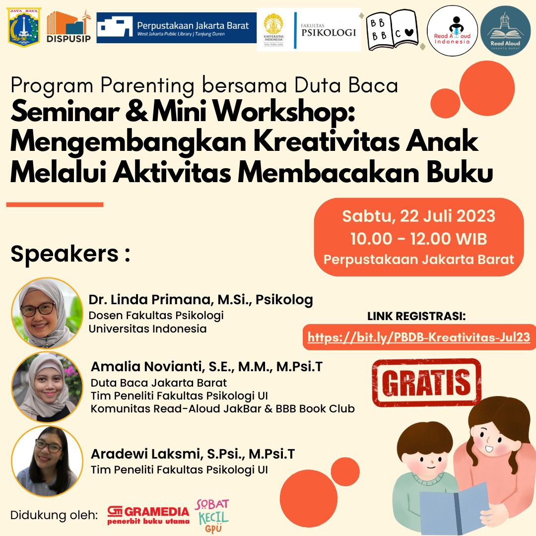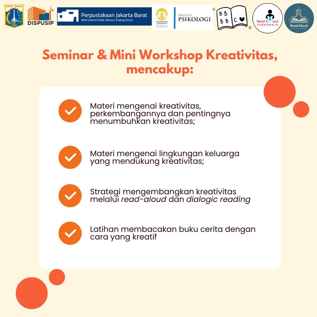 Kegiatan seminar diisi oleh materi dari Dr. Linda Primana, M.Si., Psikolog, dosen Fakultas Psikologi Universitas Indonesia, Amalia Novianti, S.E., M.M., M.PSi.T, dan Aradewi Laksmi, S.Psi., M.Psi.T. Dalam seminar, Ibu Linda menjelaskan tentang kreativitas secara umum dan pentingnya menumbuhkan kemampuan ini pada anak. Amalia menjelaskan hubungan membaca buku dengan kreativitas sementara Aradewi memandu para peserta untuk praktik berlatih membacakan nyaring untuk anak-anak.
