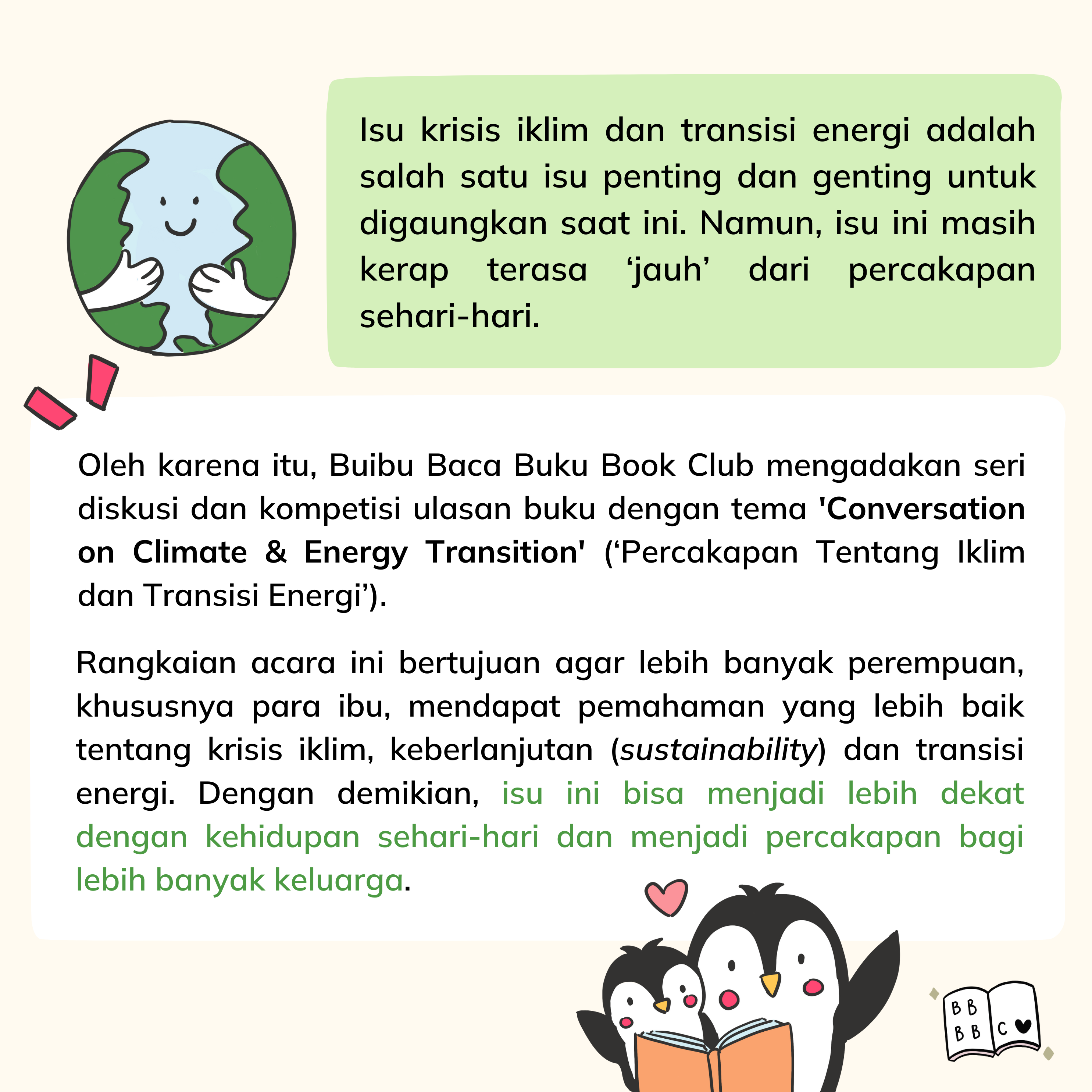 Oleh karena itu tahun ini kami kembali menyelenggarakan kompetisi ulasan buku bertema krisis iklim, keberlanjutan (sustainability) dan transisi energi. Kegiatan ini akan berlangsung mulai dari 30 Juli – 30 September. Selama kompetisi berlangsung, kami juga berkolaborasi dengan berbagai komunitas, lembaga, penerbit dan perusahaan untuk mengadakan seri diskusi online dan kegiatan offline.