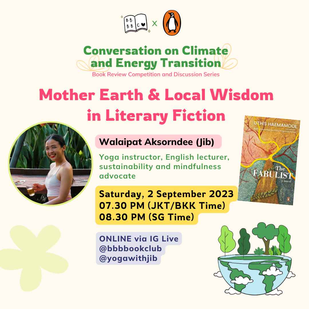 As a part of @bbbbookclub ‘s ‘Conversation on Climate and Energy Transition’, we’re going to talk about Mother Earth & local wisdom in literary fiction, for example ‘The Fabulist’, a Thai novel by Uthis Haemamool. We’re having @yogawithjib, an English lecturer from Thailand who is also a yoga teacher, sustainability and mindfulness advocate. We also asked Jib more about Thai literature and how storytelling can be a powerful medium to share the message about climate change and sustainability.