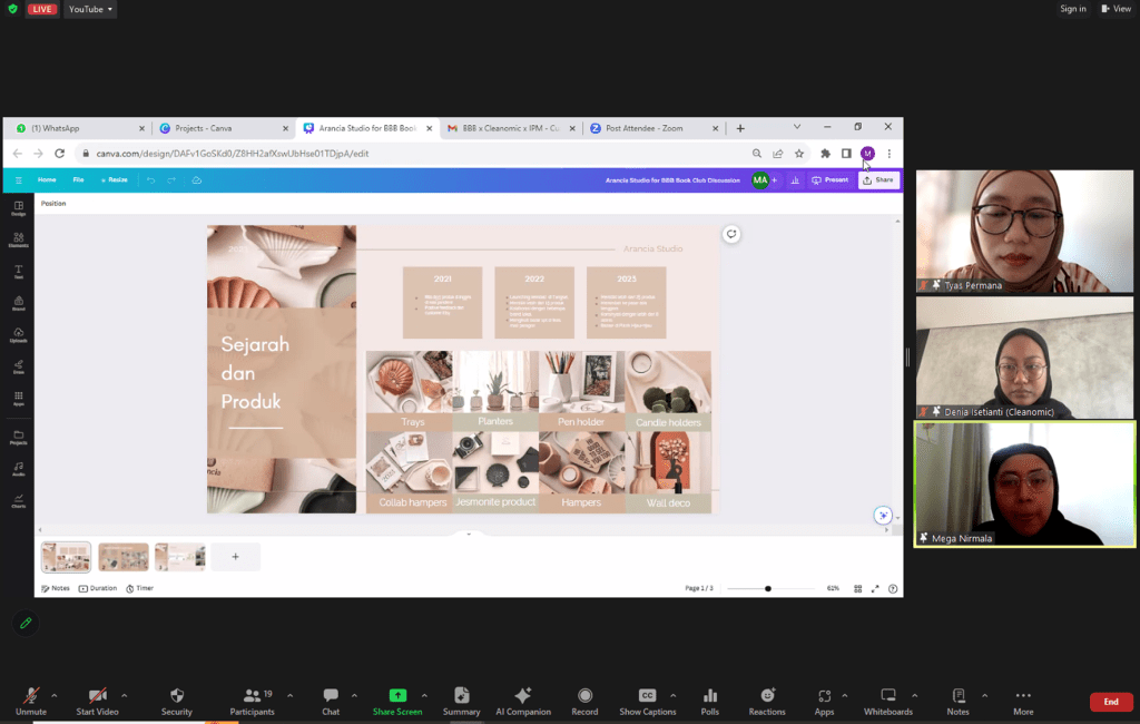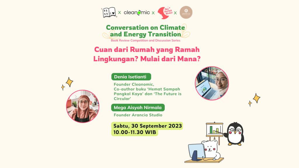 Pada diskusi ini kami membahas lebih lanjut tentang bisnis yang ramah lingkungan bersama Ibu Denia Isetianti, founder Cleanomic (@cleanomic ), dan Ibu Mega Aisyah Nirmala, founder Arancia Studio (@arancia.studio ), pada: