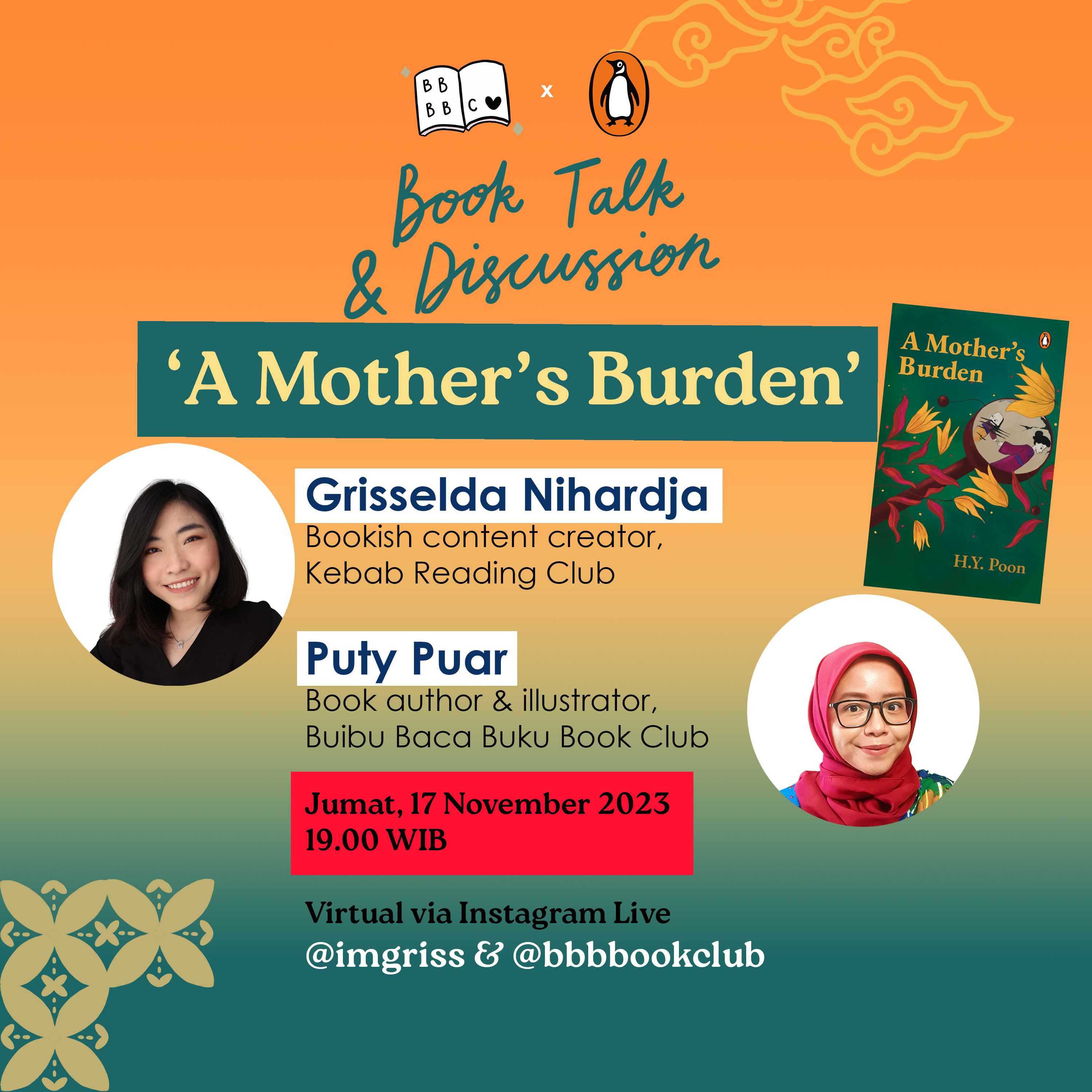 Bersama Grisselda kami membahas buku ‘A Mother’s Burden’ karya H Y Poon yang menceritakan tentang Liu Yong, seorang pegawai pengadilan di Cina pada Zaman Dinasti Song, yang berusaha mencari keadilan dalam kasus tewasnya seorang anak dengan sang ibu sebagai satu-satunya tersangka.