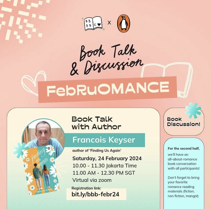 Di bulan Februari yang identik dengan perayaan Valentine, Buibu Baca Buku Book Club berkesempatan mengadakan sesi book talk bertemakan FebRuOMANCE berkolaborasi dengan Penguin SEA. Sesi book talk diadakan pada hari Sabtu, 24 Februari 2024 secara virtual melalui Zoom. Agenda book talk ini diadakan dengan mengundang Francois Keyser, penulis buku ‘Finding Us Again’ yang bergenre roman.