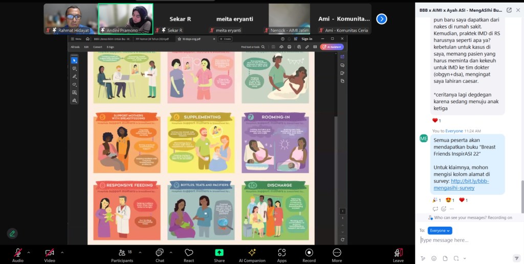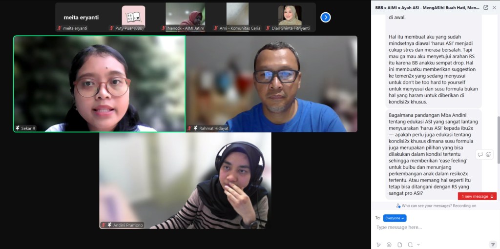 Kami juga mengundang narasumber yang kapabel untuk membahas edukASI, yaitu Ibu Andini Pramono (Ketua Divisi Riset AIMI Pusat) dan Bapak Rahmat Hidayat (co-founder AyahASI Indonesia). Pada diskusi ini kami membahas seputar ASI mulai dari manfaat menyusui, peran support system dan keberhasilan mengASIhi, keterkaitan antara mengASIhi dan gaya hidup berkelanjutan, dan tips untuk ayah dan ibu untuk menghadapi tantangan saat menyusui.