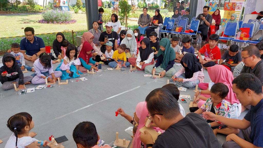 Setelah selesai membaca, teman-teman cilik yang berpartisipasi diajak untuk membuat kincir bertenaga surya! Seru sekali, deh. Anak-anak yang lebih besar bisa mengikuti instruksi dan mengerjakan sendiri, sementara anak-anak yang lebih kecil mengerjakan bersama orang tua masing-masing.