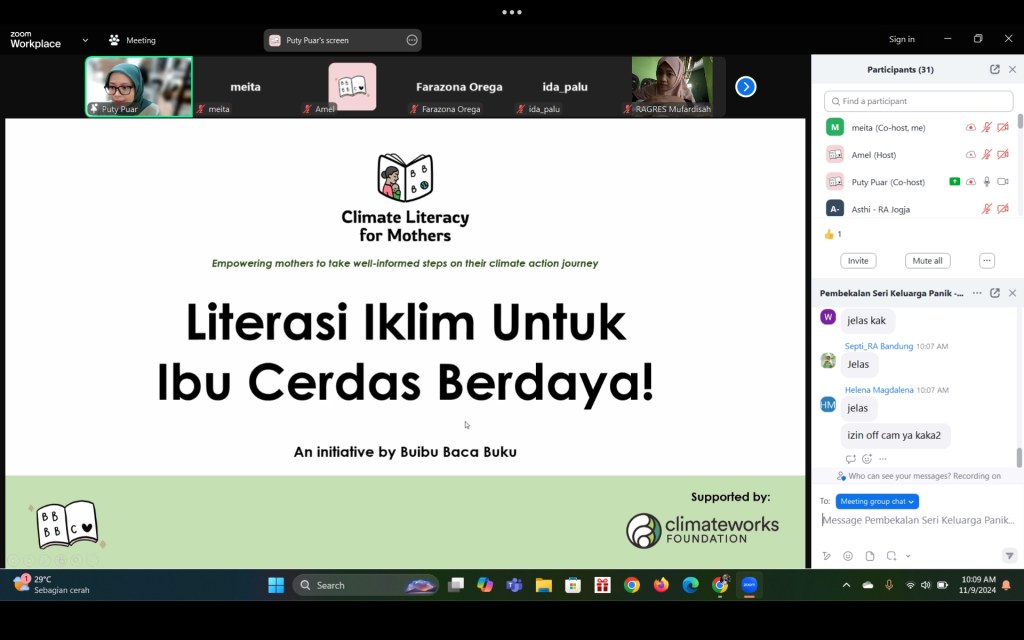 Pada hari pertama pembekalan, fokus utama materi pembekalan adalah Literasi Iklim untuk Ibu Cerdas dan Berdaya. Di sini kami juga membahas salah satu topik yang tersedia di www.buibubijak.id