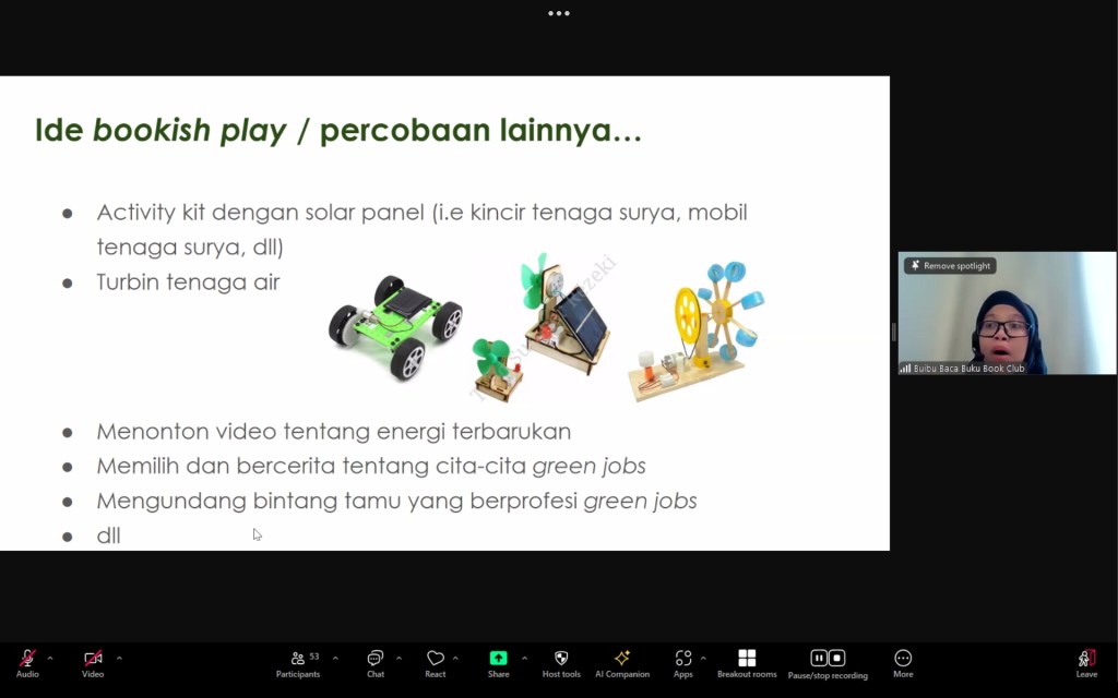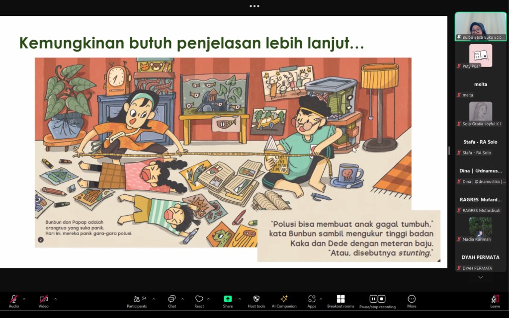 Kami bekerjasama dengan Ibu Roosie Setiawan, Komunitas Read Aloud Indonesia, dan Reading Bugs untuk melakukan sesi read aloud atau membaca nyaring dan pelatihan membaca nyaring. Tujuan dari kegiatan ini adalah agar para Buibu dan Manteman terbantu untuk memberikan informasi mengenai krisis iklim kepada anak-anak dengan cara yang menyenangkan.