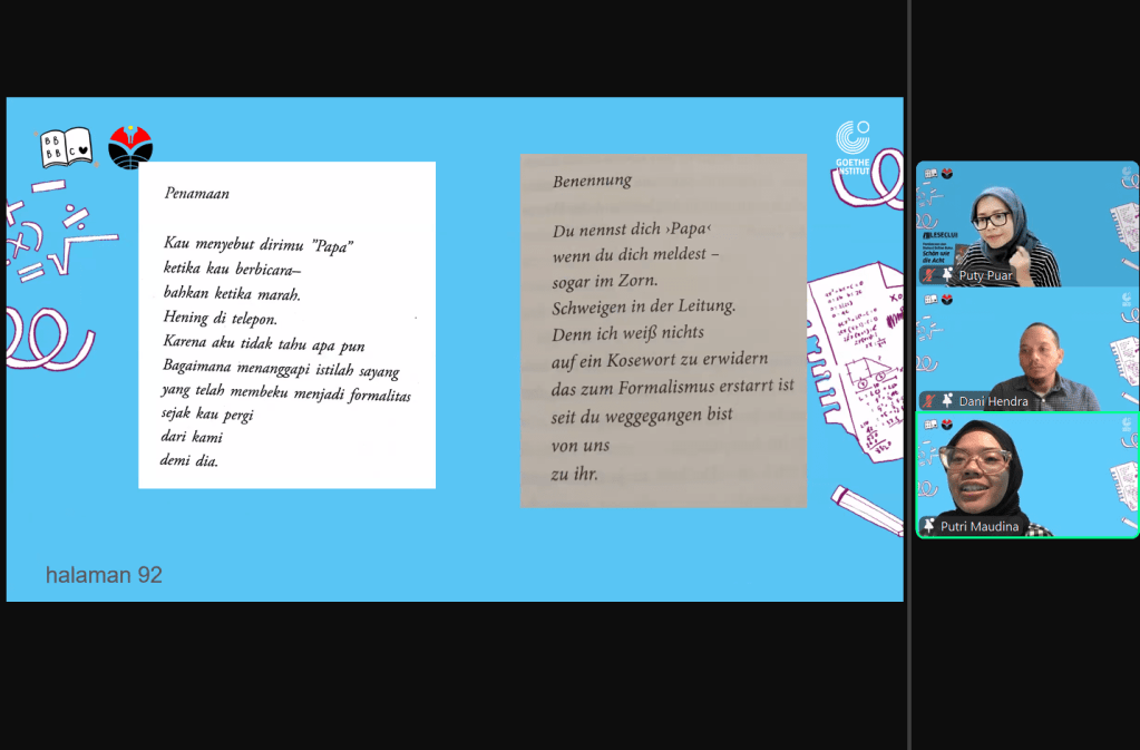 Pada Sabtu, 8 Maret 2025 kami kembali berdiskusi dengan Leseclub untuk mendiskusikan buku ini dan karakteristik puisi asal Jerman bersama Dani Hendra (Dosen Pendidikan Bahasa Jerman UPI) dan Putri Maudina (Duta Bahasa Jawa Barat 2024).