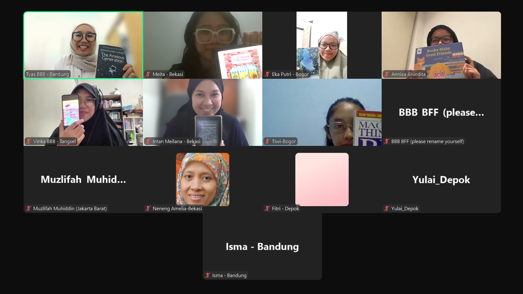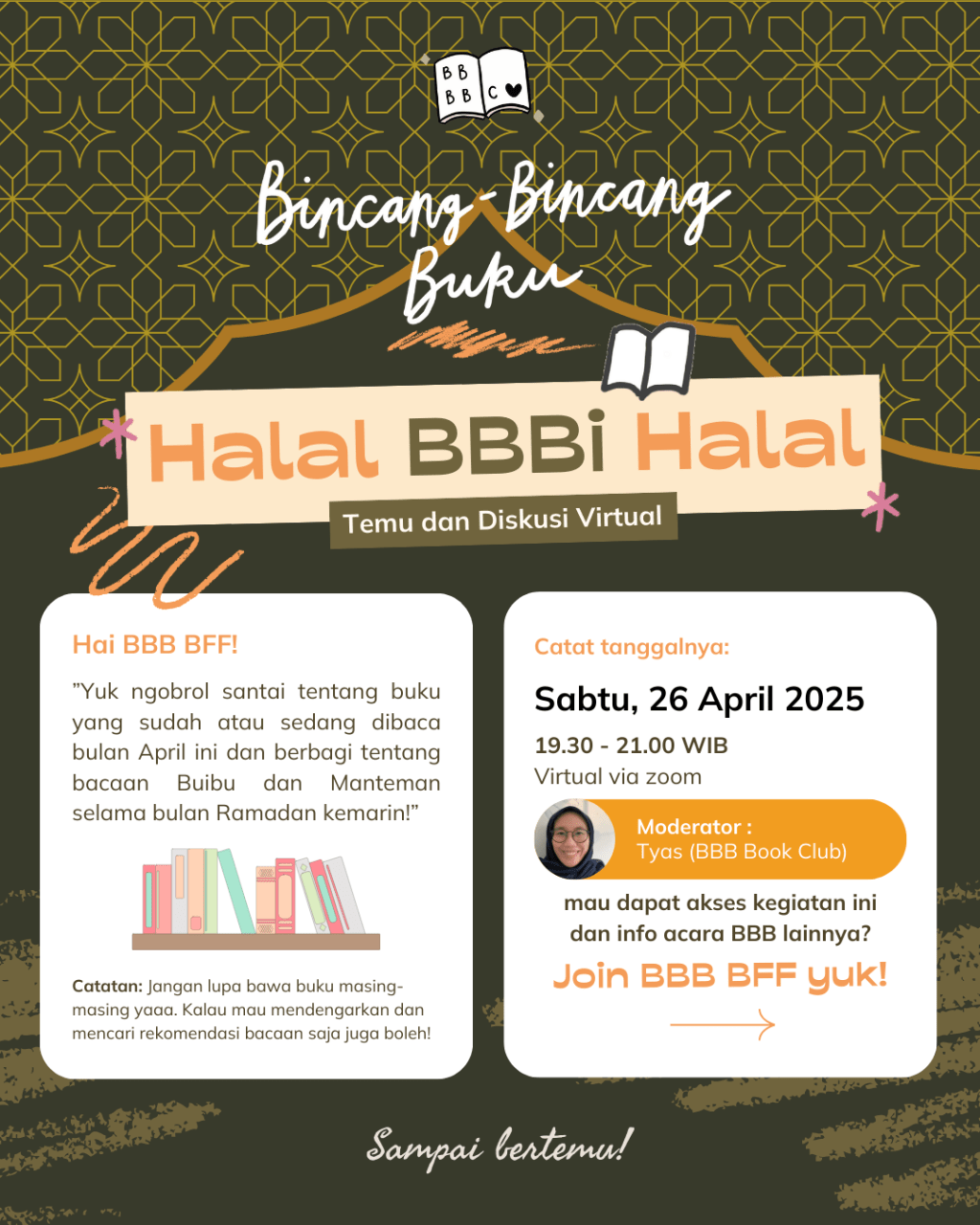 Setelah bulan Maret kemarin nggak ketemuan online, di bulan April ini Bincang Bincang Buku khusus BBB BFF hadir lagi! Kali ini dalam rangka Halal BBBi Halal! Jadiii, Buibu dan Manteman bisa berbagi buku yang dibaca sepanjang bulan April, maupun buku bacaan yang berkesan saat Ramadhan lalu.
