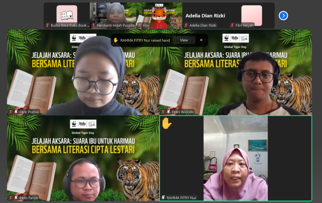 Di akhir pekan terakhir di bulan Juli, kami berkolaborasi bersama Members of Nature (MoNa) by WWF Indonesia untuk menyelenggarakan webinar bertajuk Suara Ibu untuk Harimau, Bersama Literasi Cipta Lestari dalam rangka Global Tiger Day 2025. Dalam webinar ini, kami mengundang 2 orang praktisi yang berpengalaman dalam konservasi Harimau Sumatera; Febri Anggriawan W. (Rimbang Baling, BB, Batang Hari Project Executant (Forest & Wildlife Program – Sumatra)) dan Beno Fariza Syahri (Wildlife Monitoring Specialist (Forest & Wildlife Program – Sumatra)).