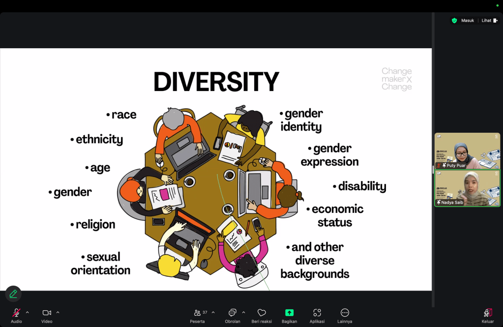Kak Nadya memberikan contoh apa yang terjadi di ChangemakerXChange, tempatnya menjadi konsultan. Karena ChangemakerXchange adalah organisasi yang global, anggotanya berasal dari berbagai negara dengan berbagai latar belakang namun tetap dipastikan bahwa semua suara akan didengar. Dengan merangkul beragam orang yang ada di dalam organisasi, akan lebih banyak ide yang akan muncul dan akan lebih banyak orang yang akan berkontribusi.