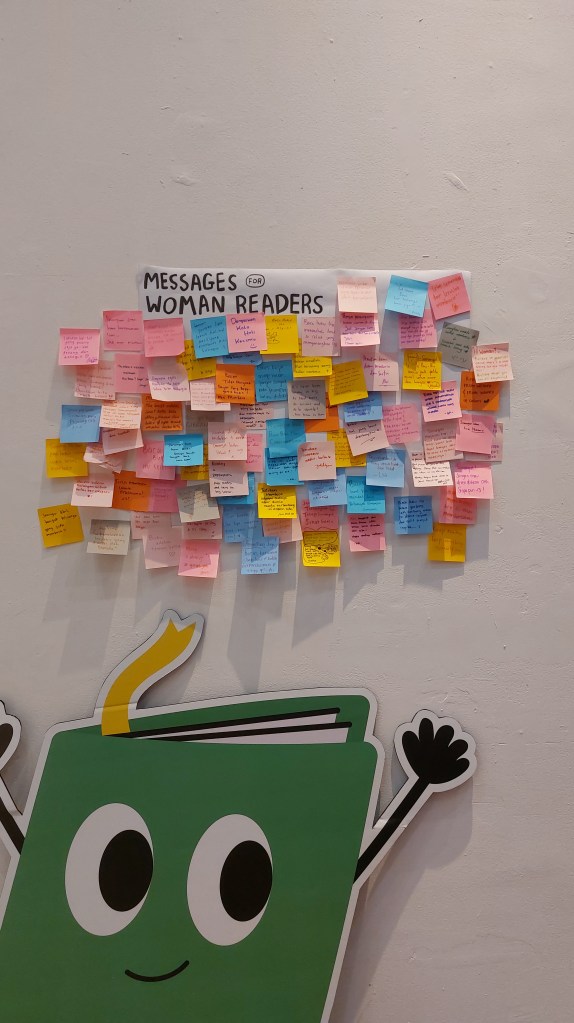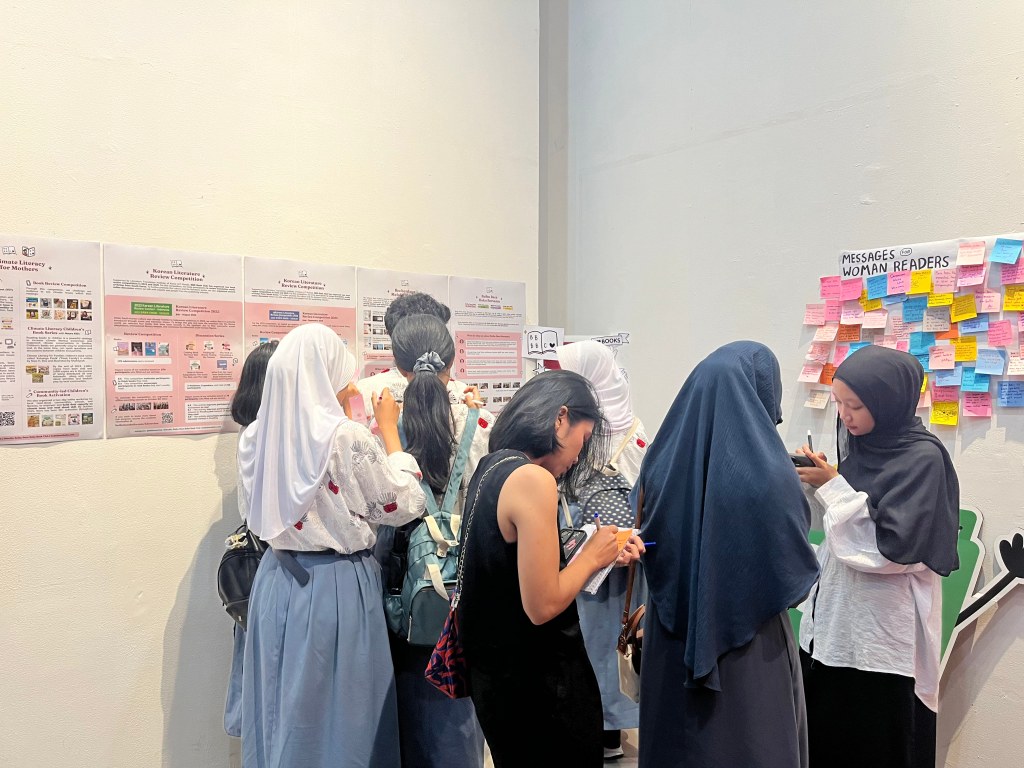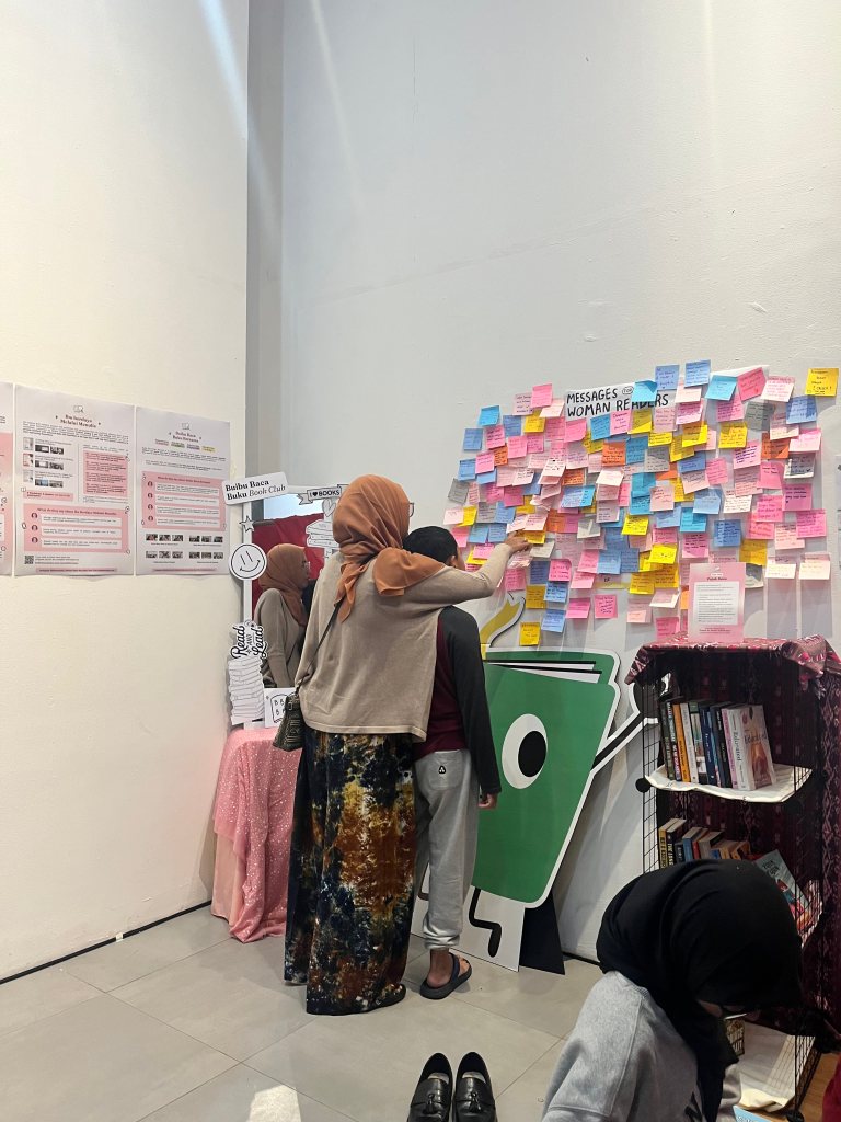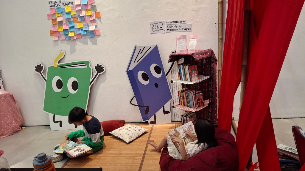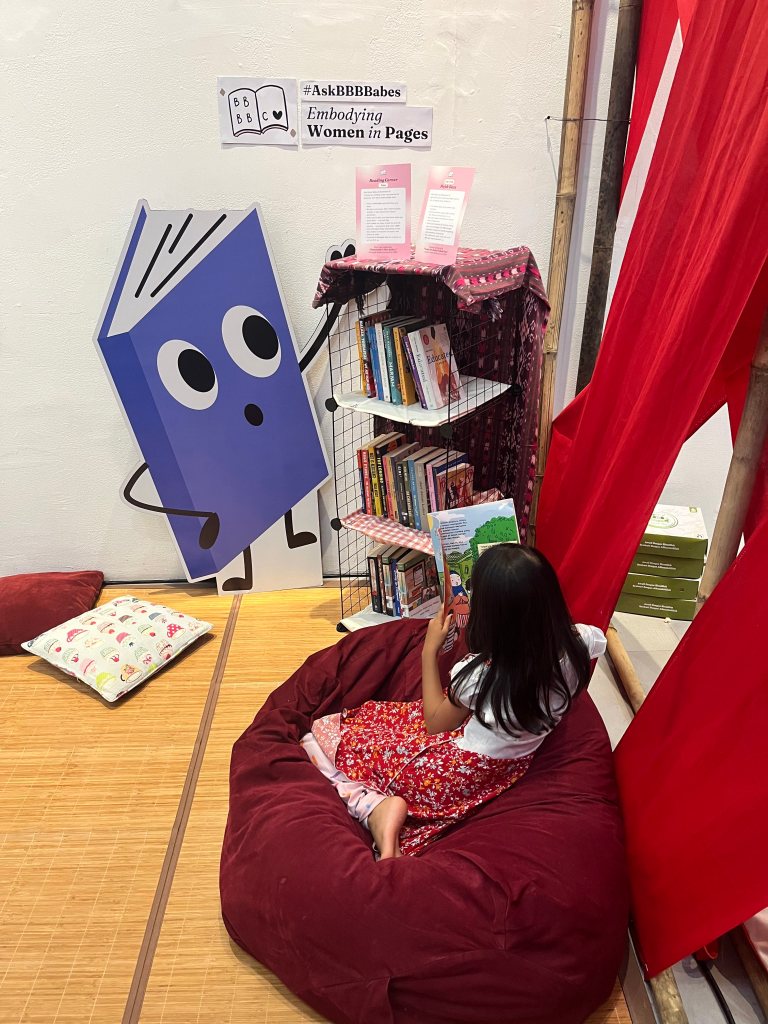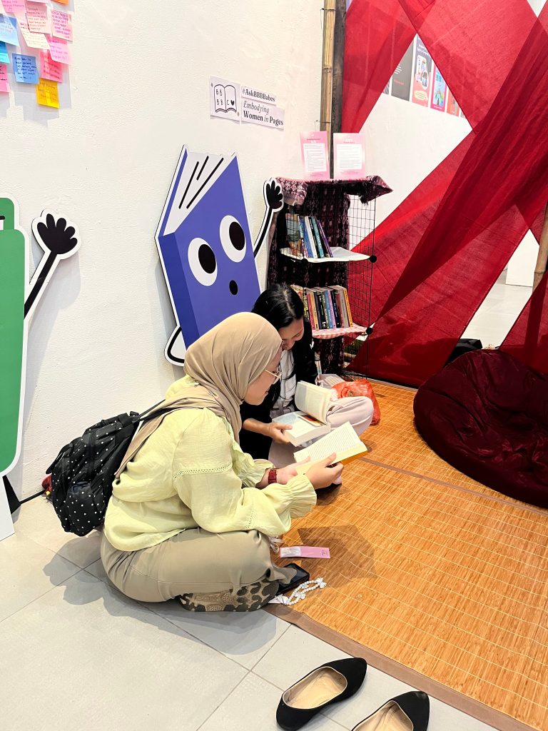 Biar tambah seru, kami juga punya pojok baca berisi buku-buku dengan tema “Perempuan sebagai Rumah” yang direkomendasikan dan dikurasi oleh BBBBabes. Pengunjung bisa baca-baca dengan nyaman sambil istirahat sebentar. Pengunjung juga bisa menulis pesan di dinding “Message for Woman Readers” dan menjawab kuis untuk mendapatkan merchandise BBB Book Club yang lucu-lucu.