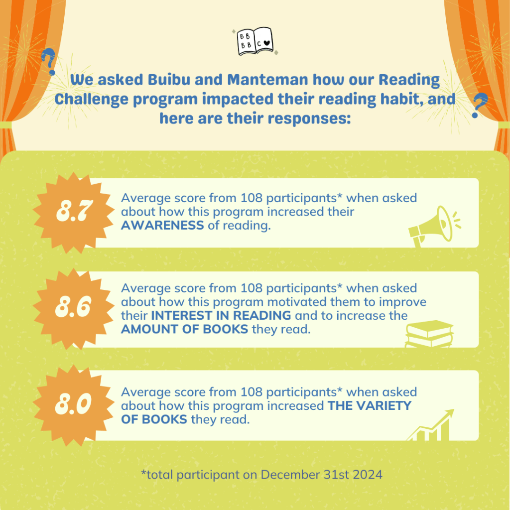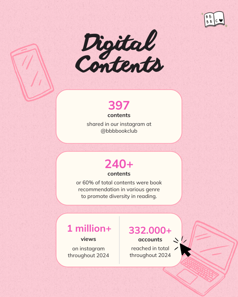 As a community, we grew our audience to 45,000 + on instagram (@bbbbookclub), 2,200+ members BBB BFF (Buibu Baca Buku Best Friend and Family), and continue to manage our WhatsApp Community Group with 700+ members and 5 sub-groups by the end of 2024.