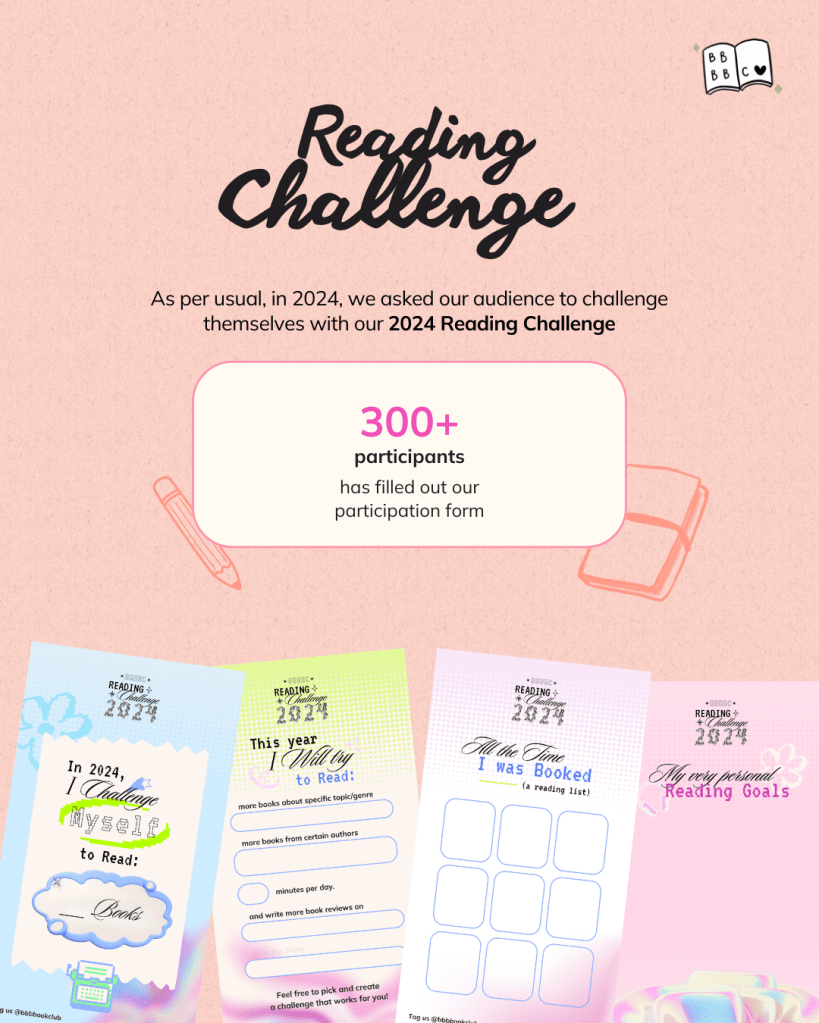 In 2024, we shared 390+ posts on our Instagram page with 60% (240+) posts were book recommendations from various genre to encourage our audiences to read more diverse books.