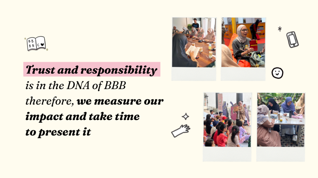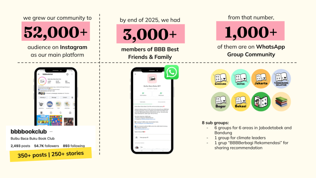 As community, we grew our audience into 52,000+ on instagram as our main platform. By the end of 2025, we also had 3,000+ members of BBB BFF (Buibu Baca Buku Best Friends and Family) and from that number, 1,000+ of them are on Whatsapp Group Community. We now have 8 sub-group where we interact closely with BBB BFF.
