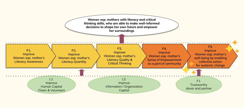 We updated our impact model by including enabling collective action and driving systemic change as a strategic process to achieve what we aim: More women, especially mothers, have literacy and critical thinking skills, so they can make well-informed decisions to shape her own future and empower her surroundings.